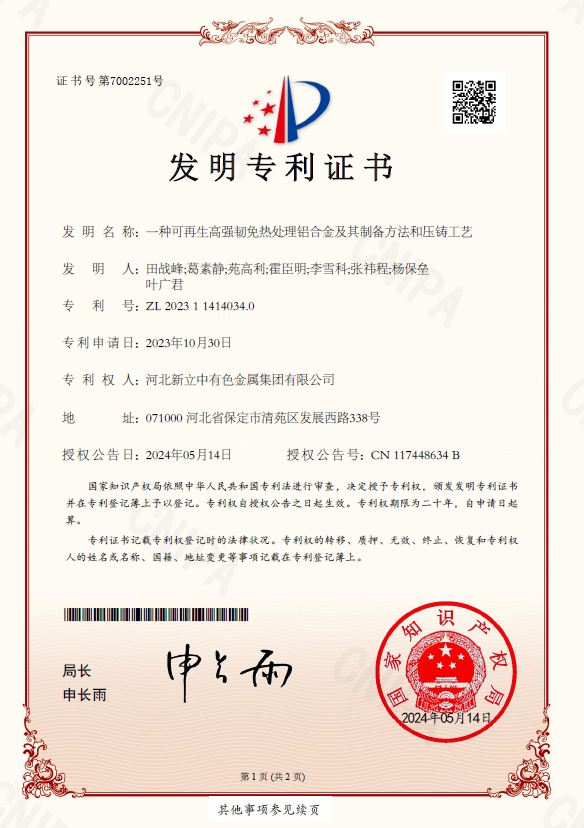 太阳集团集团作为国内免热处理合金材料的先行者,持续加强免热处理合金材料的纵向深度研发,5月14日公司正式获得“低碳再生免热处理铝合金”发明专利,专利名称为“一种可再生高强韧免热处理铝合金及其制备方法和压铸工艺”(专利号ZL 202311414034.0)。