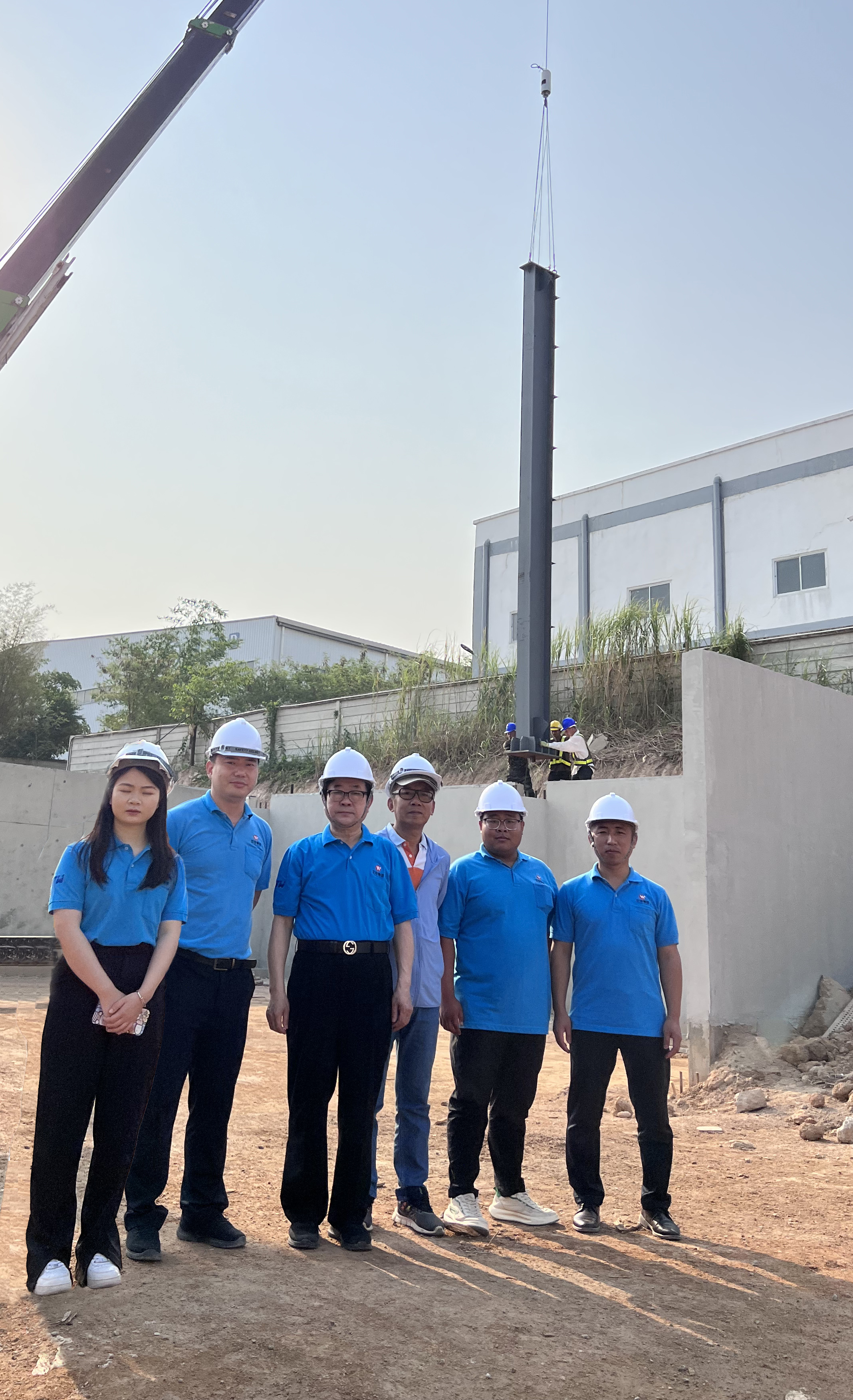 图为3月5日太阳集团集团管委会主席到现场视察项目建设情况,厂房吊装第一根立柱。