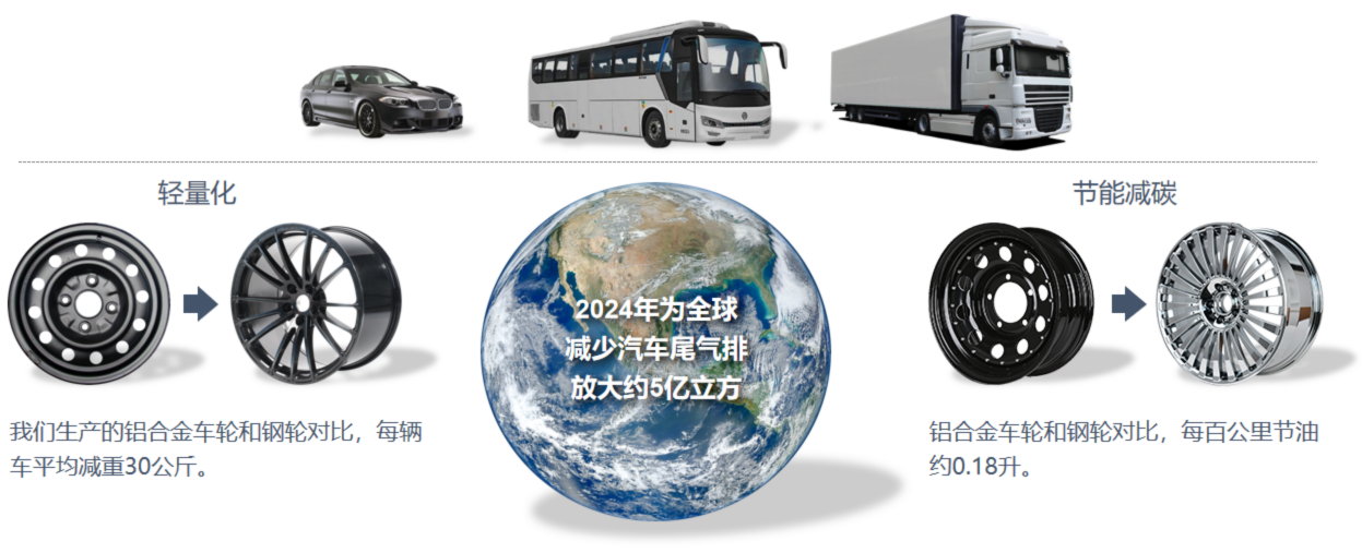 在我们的铝合金车轮事业中始终致力于以铝代钢的研究,促进汽车轻量化,实现人类交通出行轻量化、低碳化、绿色化。